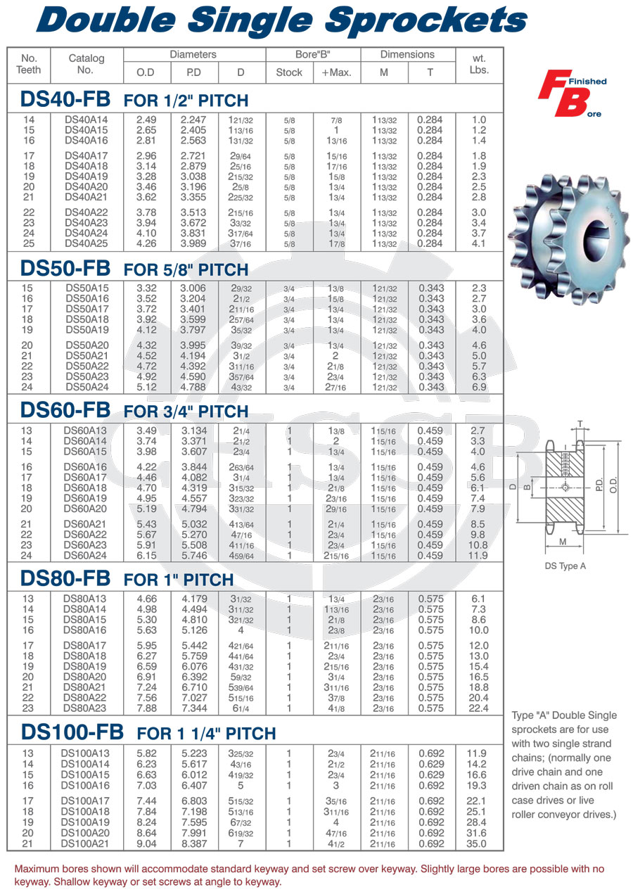 Range of product: ANSI:(DS-40FB/DS50-FB/DS60-FB/DS80-FB/DS100-FB) Inch size product (Apply to ANSI market) FB Double Single Sprockets